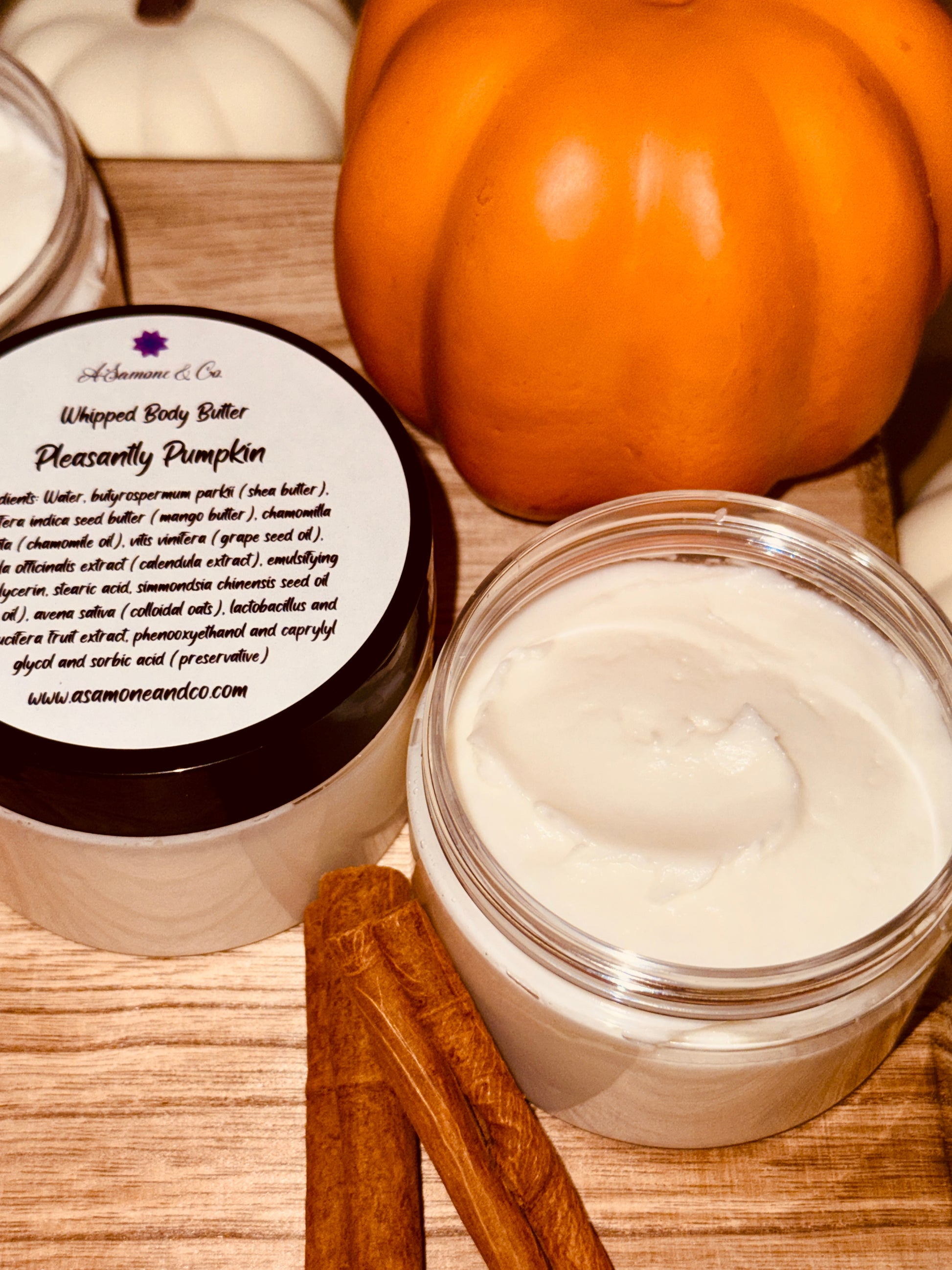 This body butter is a seasonal skincare treat. Our pumpkin spice scent and rich texture is sure to make your skin silky. Aiming to protect skin, particularly during the cooler months it's a must for skin care. It captures the essence of Fall making it a perfect indulgence or gift for our Pumpkin lovers. Dont forget to complete the collection with our Pleasantly Pumpkin Body Oil.